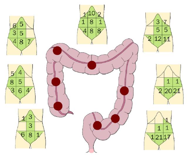 (Субъективная локализация провоцируемой абдоминальной боли у 48 пациентов с СРК. Swarbrick et al., 1980)