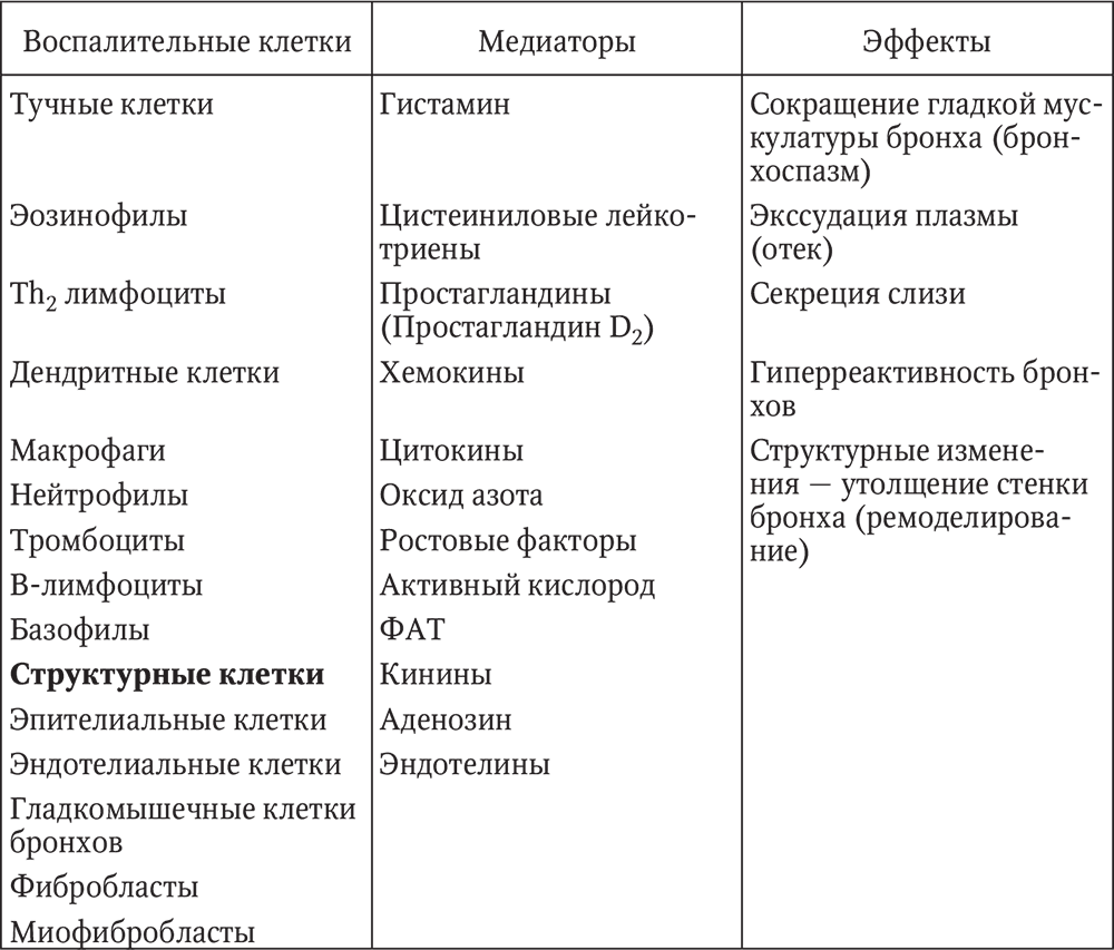 В формировании воспалительного процесса в дыхательных путях у больных БА участвуют различные клетки, выделяющие большое количество биологически активных веществ (более 100 провоспалительных медиаторов), которые вызывают развитие и персистенцию воспаления (табл. 11).