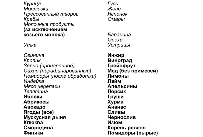 Следует помнить, что ниже приведены пищевые продукты, являющиеся кислото– или щелочеобразующими. Так, то, что лимон имеет кислый вкус, не означает, что этот вкус сохраняется после соединения с пищеварительным соком. Фактически, лимон становится щелочным, – отсюда его появление здесь среди щелочных продуктов.