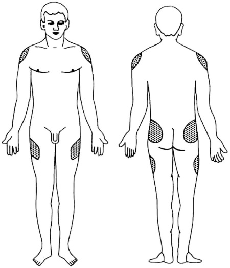 Выберите и осмотрите анатомические области, которые обычно используются для внутримышечных инъекций: широкую латеральную мышцу бедра, верхний наружный квадрант ягодицы, дельтовидную мышцу.