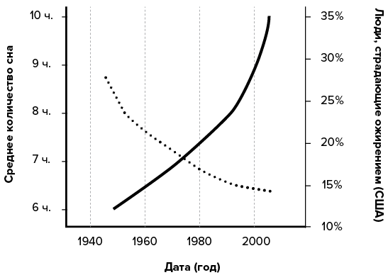 Основываясь на данных, собранных за последние три десятилетия, можно заключить, что повсеместное распространение дефицита сна, вполне вероятно, служит ключевым фактором роста эпидемии ожирения. Эпидемиологические исследования установили прямую зависимость между набором лишнего веса и развитием ожирения и недосыпанием. В самом деле, если составить диаграмму сокращения времени сна за последние пятьдесят лет (пунктирная линия) и совместить ее с графиком распространения ожирения за тот же период (сплошная линия), как видно на рис. 13, данные ясно показывают эту связь.