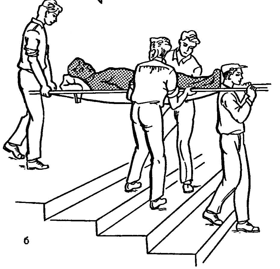 При отсутствии транспорта переносят пострадавшего в лечебное учреждение на стандартных импровизированных носилках, при помощи лямки или на руках.