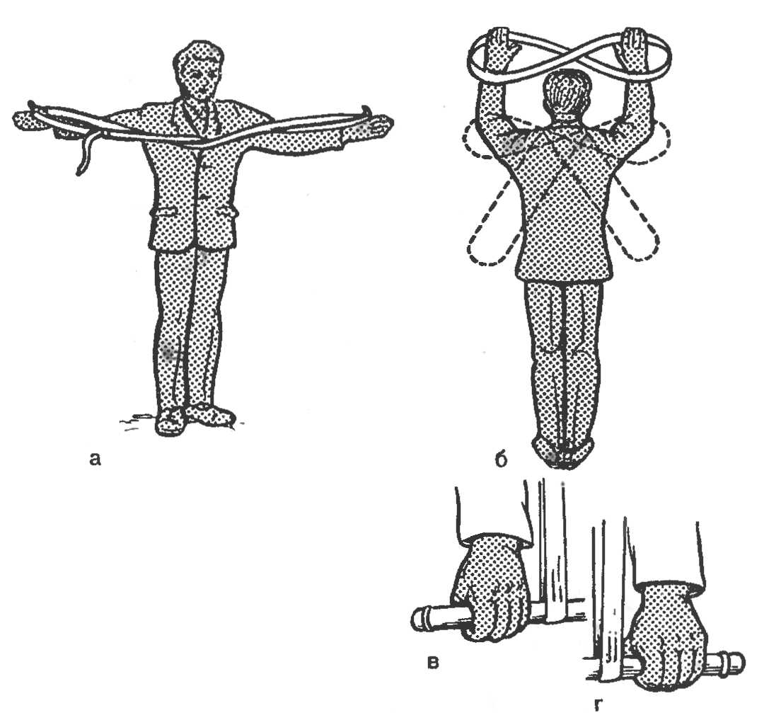 Носилочная лямка — брезентовый ремень длиной 3,5 м, шириной 6,5 см, имеющий на одном конце прочную металлическую пряжку для соединения с другим концом. Из лямки делают петлю в виде восьмерки и подгоняют ее под рост носильщика. Длина петли должна быть равна размаху вытянутых в стороны рук (рис. 9, а, б). Петлю надевают на плечи так, чтобы перекрест ее был на спине, а петли, свисающие по бокам, — на уровне кистей опущенных рук. В эти петли продевают ручки носилок. Носильщик, идущий впереди, захватывает ручки носилок впереди лямок, идущий сзади — сзади лямок (рис. 9,в,г).