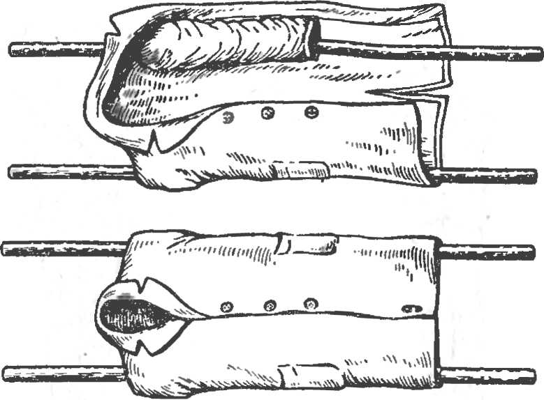наружная часть костыльком должна упираться в подмышечную впадину, а противоположный ее конец должен выходить на 12—15 см за подошву; короткая внутренняя часть костыльком должна упираться в промежность и также выходить за подошву на 12—15 см. Боковые шины проводят сначала через петли деревянной подошвы, затем устанавливают в подмышечной и паховой областях. За подошвой половинки шины соединяют шарнирной дощечкой.