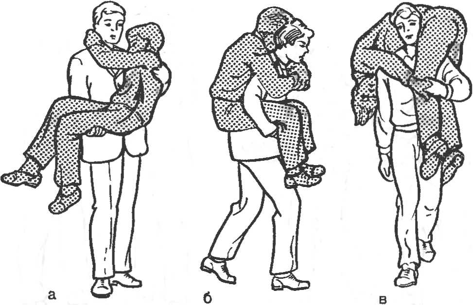 Рис. 11. Перенос пострадавшего одним человеком. а — на руках; б — на спине; в — на плечах.