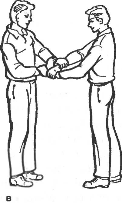 а — друг за другом; б — на «замке» из трех рук; в — на «замке» из четырех рук.