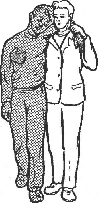 В ряде случаев пострадавший может преодолеть короткое расстояние самостоятельно с помощью сопровождающего. Сопровождающий закидывает себе на шею руку пострадавшего и удерживает его одной рукой, а другой обхватывает больного за талию или грудь. При передвижении пострадавший свободной рукой может опираться на палку (рис. 14).