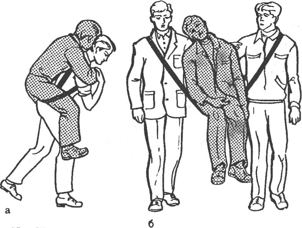 Рис. 13. Перенос пострадавшего при помощи лямки одним человеком (а) и двумя (б).
