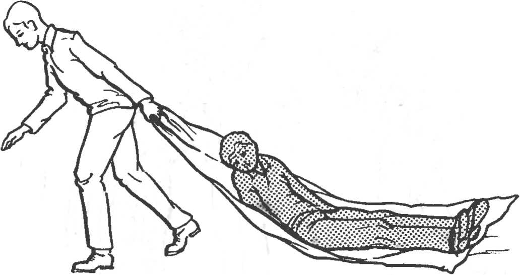 Рис. 15. Транспортировка пострадавшего волоком на брезенте или плащ-палатке.
