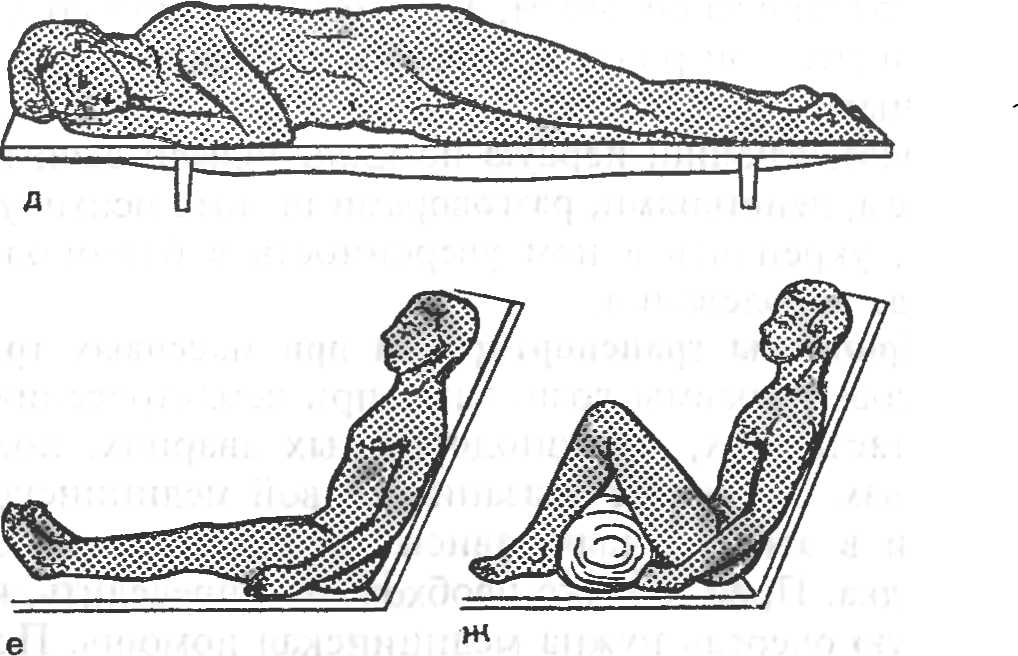 а — на спине; б — на спине с согнутыми в коленях ногами; в — на спине с опущенной головой и приподнятыми нижними конечностями; г-на животе; д — на боку в фиксированно-стабилизированном положении; е — в полусидячем положении; ж — в полусидячем положении с согнутыми в коленях ногами.