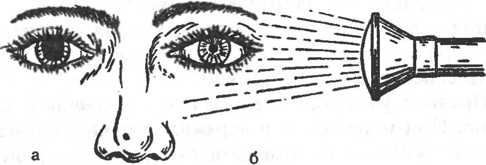Рис. 3. Определение реакции зрачка на свет. а — зрачок до воздействия пучком света; б — после воздействия.