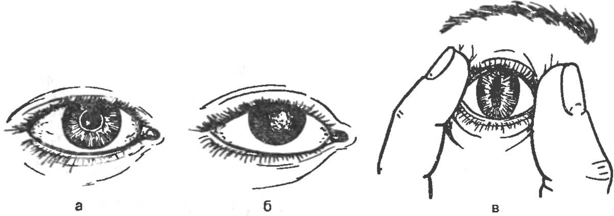 Рис. 4. Явные признаки смерти. а — глаз живого человека; б — помутнение роговицы у мертвого человека; в — симптом «кошачий глаз».
