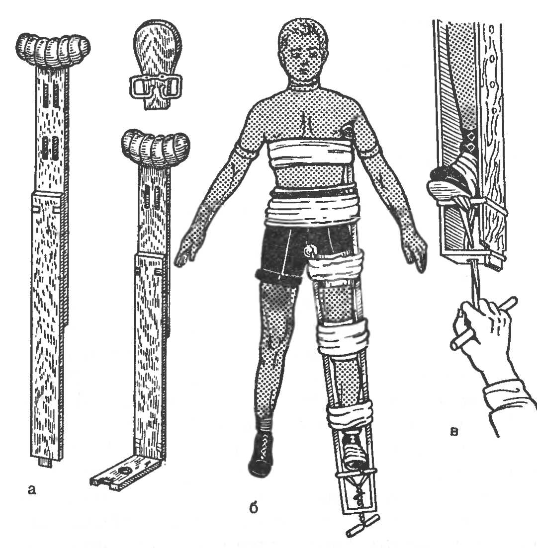 Всю шину фиксируют к груди, животу, бедру и голени лямками, турами бинта. От деревянной подошвы к соединительной планке костыльков проводят прочный двойной шнур, закручивая который, осуществляют некоторое вытяжение конечности (рис. 5).