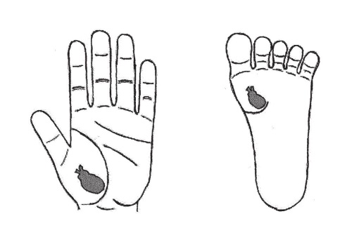 При частой одышке, которая сопровождает многие патологии сердца, воздействуют на зону сердца (рис. 17, а, б) и на зону подобия легких (рис. 10, а, б). Сначала щупом проверяют зону сердца и стимулируют все болезненные точки в этой зоне. Затем проводят массаж зоны легких, который стимулирует прохождение воздуха. Массаж проводят пальцами, щупом или карандашом не менее 10 минут. Направление массажа соответствует направлению выдоха, то есть от основания большого пальца к дистальной фаланге вдоль трахеи.