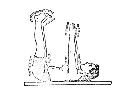 Исходное положение: лечь на спину на пол или на твердую, ровную кровать, под шейные позвонки положить твердую подушку или валик, затем поднять вверх обе ноги и руки так, чтобы ступни ног держались параллельно полу или потолку (т. е. горизонтально к туловищу). В таком положении начинайте вибрировать (трясите) обеими руками и ногами одновременно. Это упражнение необходимо выполнять в течение 1–3 минут утром и вечером на счет 240–360 (рис. 10).