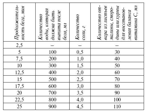 Если бег вызвал потоотделение, то по его окончании нужно принять холодную ванну или душ, чтобы очистить тело от выделившихся продуктов обмена, а в течение двух часов после водной процедуры восстановить водно-солевой баланс и баланс витамина С, выпив чистой некипяченой воды, поев немного овощей с солью и приняв витамин С. Все подробности смотрите в таблице.