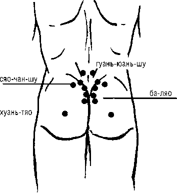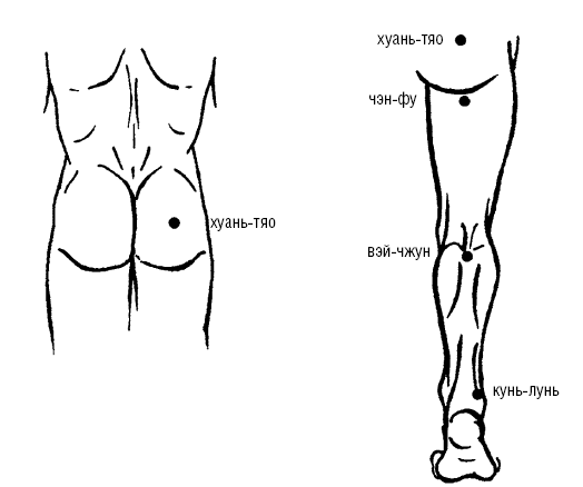 1. ХУАНЬ-ТЯО (V-30) находится сзади от тазобедренного сустава на 3 цуня в направлении к области крестца. При сгибании ноги в коленном суставе пятка в проекции на области таза.