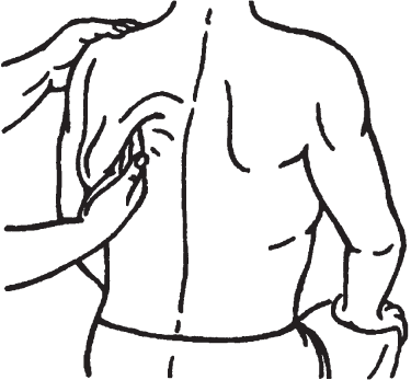 Массажист находится справа от больного, левая рука обхватывает правое надплечье больного, а правой рукой пальцами со 2 по 5, начиная от прикрепления широчайшей мышцы спины, производит мелкие растирания в сторону наружного края лопатки по направлению к ее нижнему углу. Затем производит растирание 1 пальцем правой кисти вдоль внутреннего края лопатки, вплоть до уровня плеч. Далее – растирание и разминание верхнего края трапециевидной мышцы вплоть до затылка. Затем массажист воздействует на левую лопатку, начиная массаж 1 пальцем правой кисти от прикрепления широчайшей мышцы спины, доходит по наружному краю до нижнего угла левой лопатки и продолжает растирание пальцами со 2 и 5 по внутреннему краю лопатки и до затылка.