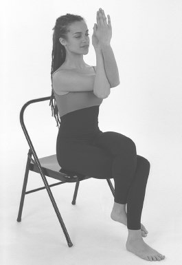 Обычный вариант Гарудасаны. Так же как и в адаптированном варианте позы, согните руки в локтях и поднимите их так, чтобы они оказались на уровне груди. Положите правую руку на сгиб локтя левой. Соедините руки вместе и переплетите пальцы. Дыхание размеренное. Удерживайте эту позу 10–15 секунд.