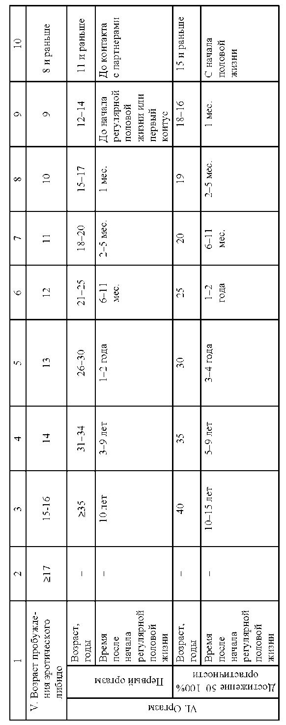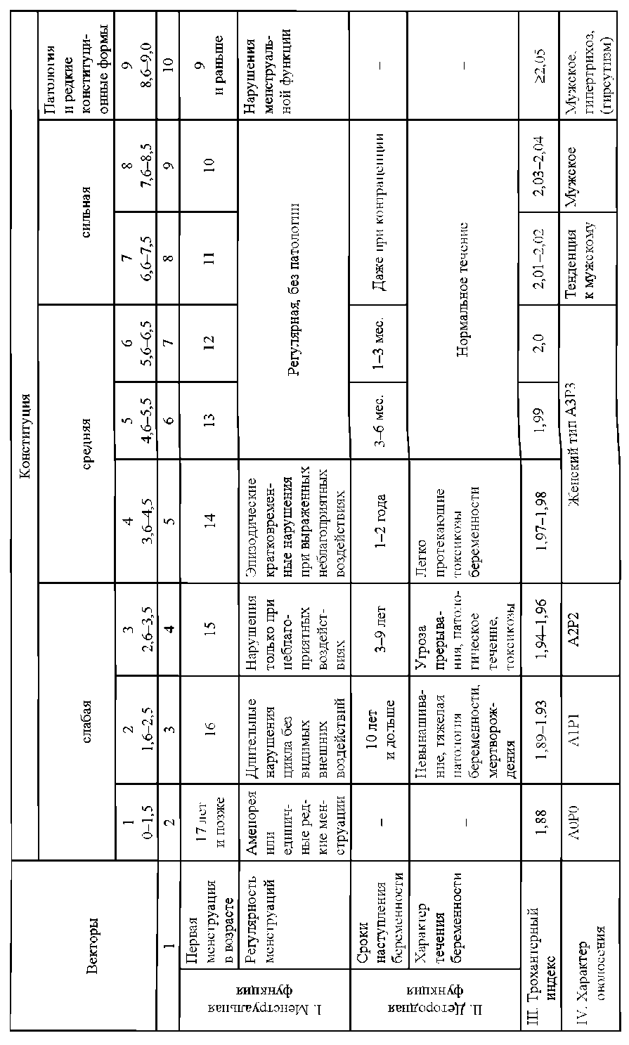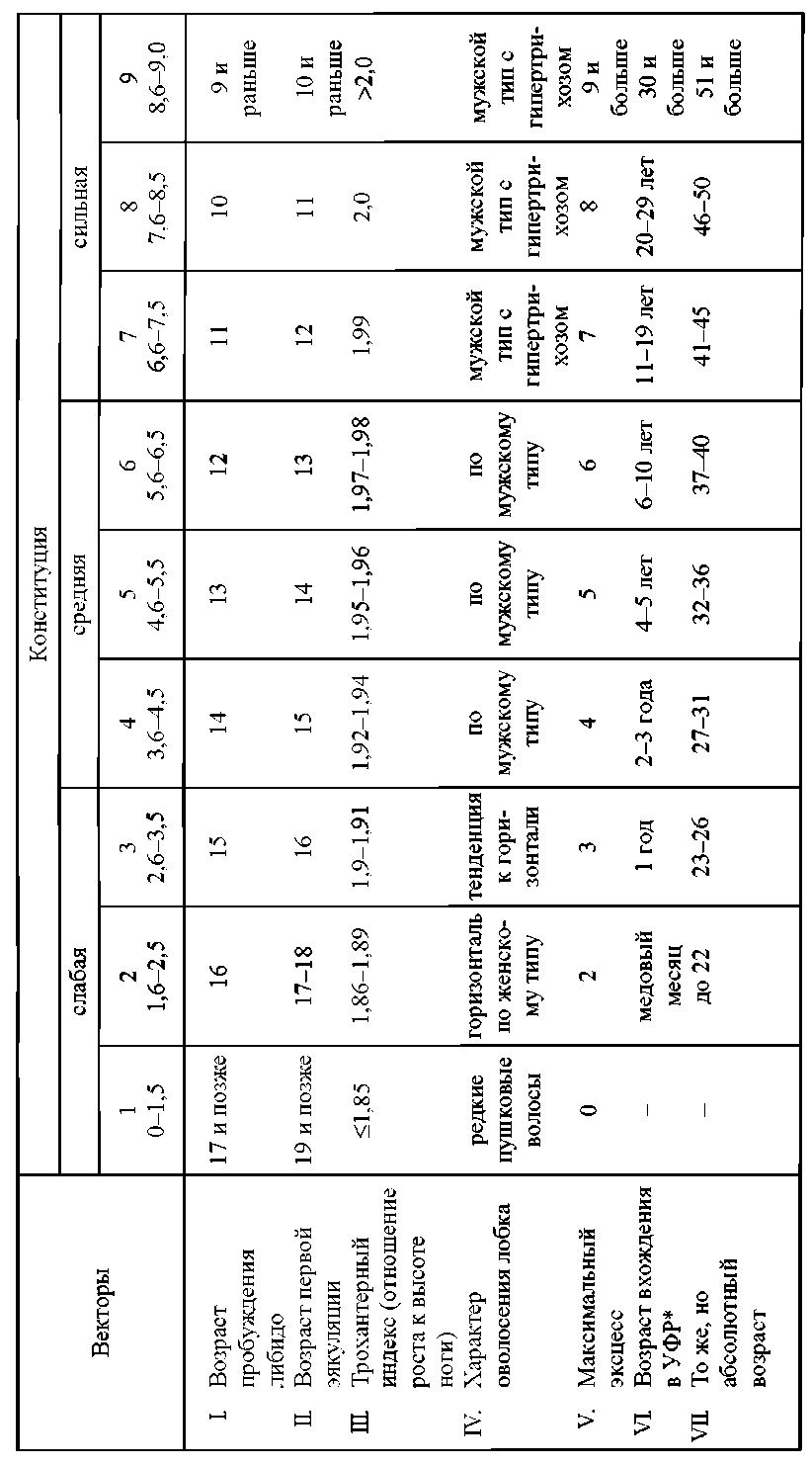 Основным недостатком всех систем критериев было полное игнорирование функциональных проявлений сексуальности. Г. Васильченко (1977) предложил свою шкалу векторного определения половой конституции мужчин (табл. 1). Позже аналогичная шкала определения половой конституции была предложена и для женщин (табл. 2).