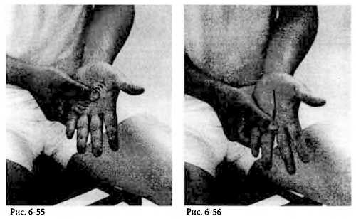 Повторите такой растирающий массаж на ладони (рис. 6-55). Надавливая, делайте выталкивающие движения от запястья к основаниям пальцев (рис. 6-56).