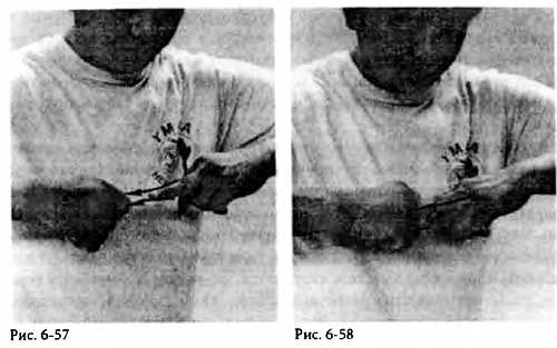 Захватывайте каждый палец и несильно тяните его, позволяя ему естественно выскальзывать из захвата (рис. 6-57). Повторите это трижды для каждого пальца. В результате к кончикам пальцев направится ци. Затем захватывайте последнюю фалангу каждого пальца и мягко тяните и потряхивайте ее несколько раз (рис. 6-58).