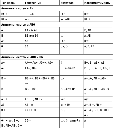 Типы крови по содержащимся в них антителам и антигенам с учетом Rhфактора