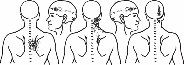 Особенность триггерных точек в том, что они вызывают отраженную боль. Так, очень часто триггерный пункт в верхней части трапециевидной мышцы становится причиной головной боли в области затылка. Триггерная точка, расположенная в области жевательной мышцы, вызывает головную боль в височной области.