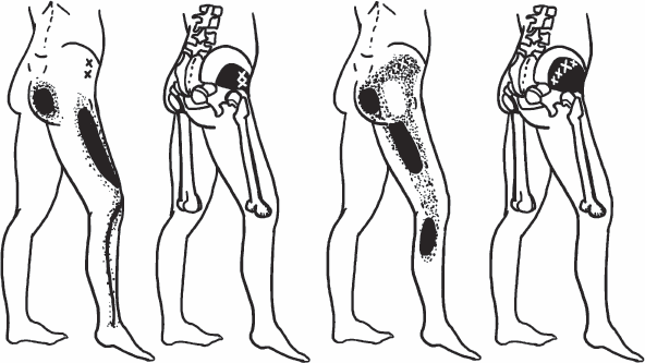 Триггерная точка, находящаяся в области средней ягодичной мышцы, может вызывать боль по наружной части бедра.