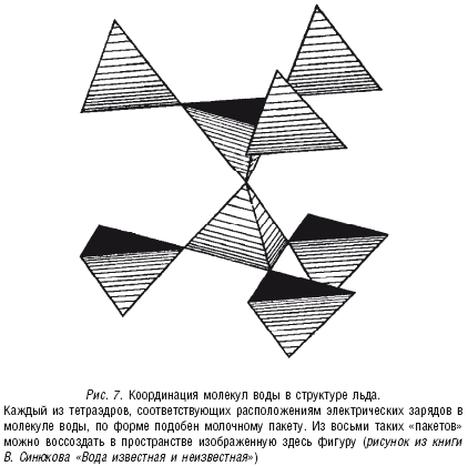 В результате рентгенографического изучения структуры льда была установлена его тетраэдрическая структура: каждый атом кислорода связан водородными связями с четырьмя другими атомами кислорода. Эти четыре атома, соответствующие четырем молекулам воды, образуют как бы элементарные ячейки, из которых и выстраивается ажурная решетка кристаллического льда (рис. 7).