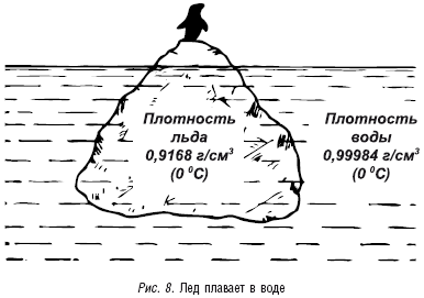 Мы уже знаем, почему лед легче воды. Если же мы посмотрим на рисунок 8, то увидим, что плотность льда при 0 °C равна 0,9168 г/см3, а плотность воды, в которой он плавает, – 0,99984 г/см3 (и тоже при 0 °C).