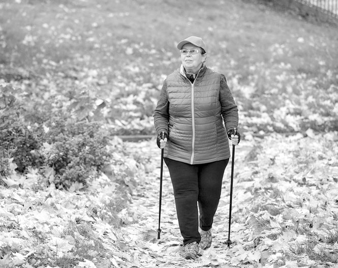 Положительно влияет ходьба с палками и на массу тела – она уменьшается, а жировая прослойка замещается более тяжелой мышечной. В целом все тело становится более подтянутым, что положительно влияет на позвоночник.