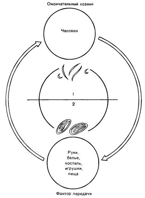 1 - половозрелые особи в кишечнике человека; 2 - яйца в окружающей среде