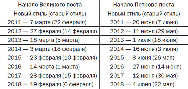 Продолжительность этого поста каждый год разная. Самый продолжительный пост длится шесть недель, а самый короткий – неделю и один день. Этот пост, который сейчас мы называем Петровым, или апостольским, раньше называли постом Пятидесятницы.