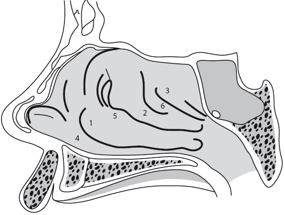 1 — нижняя носовая раковина; 2 — средняя носовая раковина; 3 — верхняя носовая раковина; 4 — нижний носовой ход; 5 — средний носовой ход; 6 — верхний носовой ход
