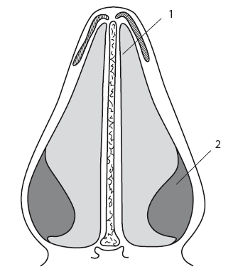 Начальная часть полости носа, преддверие, покрыта кожей, по своему строению имеющей сходство с кожей наружного носа. Как на боковой, так и на срединной поверхностях преддверия находятся короткие толстые волоски, которые в определенной степени задерживают проникающие в нос с воздушным потоком крупные пылевые частицы. Просвет преддверия определяется формой и расположением нижних боковых хрящей. Если они утрачивают упругость и эластичность в связи с созданием в полости носа на вдохе отрицательного давления, происходит западание крыльев носа, что приводит к затруднению носового дыхания.