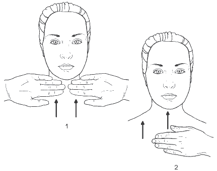 1. Пальцы рук напрячь и всей плоскостью легко, но энергично помассировать снизу вверх поглаживающими движениями всю переднюю часть шеи от ключицы к подчелюстной области.