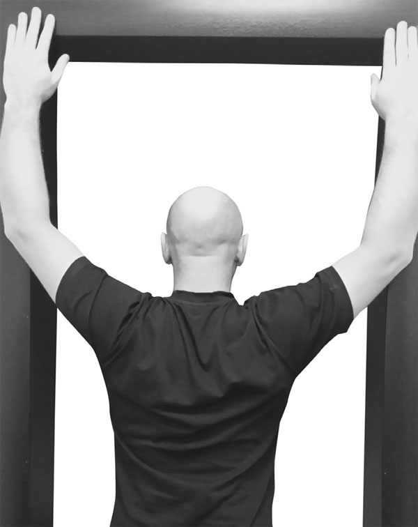 Упражнение в проеме двери. В дверном проеме ставите руки в положение локтя на уровне глаз или чуть выше. Смещаете центр тяжести вперед (см. рис. 36).
