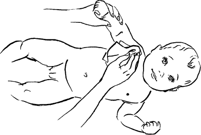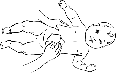 • И, наконец, снова вернув малыша на спинку, оботрите грудь, животик и ножки (рис. 143в).