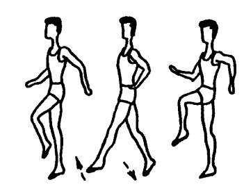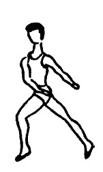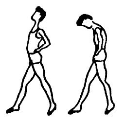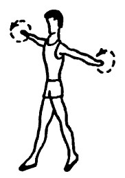 Упражнения нужно начинать с обычной ходьбы, затем следует ходьба окрестным шагом и ходьба с высоким подниманием бедер (рис. 12). На ходьбу затрачивается 2–3 минуты. Продолжая движение, развести руки в стороны. Сжав кисти в кулак, сделать 10–20 круговых движений в плечевых суставах вперед, а затем столько же назад (рис. 13). После этого следуют 2–3 дыхательных упражнения — глубокий вдох-выдох (рис. 14).
