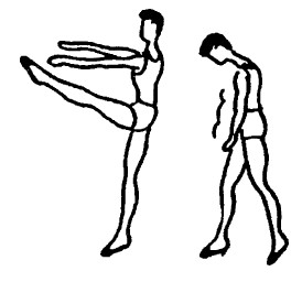 В движении из исходного положения — руки вперед в стороны — на каждый шаг на выдохе доставать носком левой ноги правую ладонь, а носком правой — левую ладонь. Повторить 8–12 раз, затем сделать 2–3 дыхательных упражнения с расслаблением рук (рис. 15).