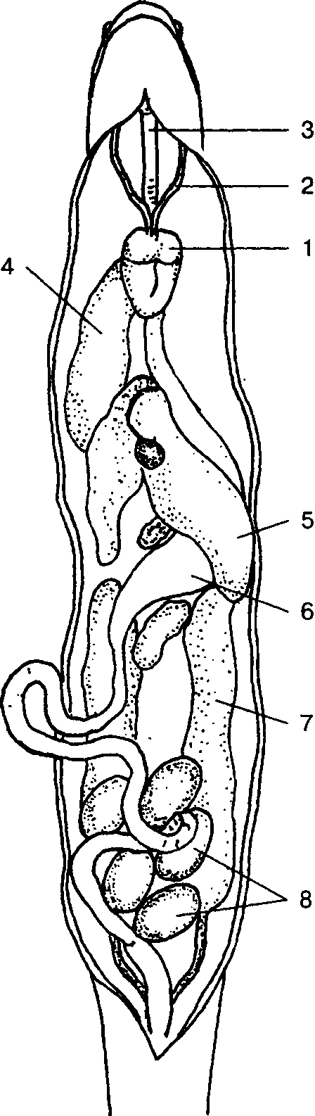 Анатомия змеи: 1 – сердце;.2 – сонная артерия; 3 – пищевод; 4 – лёгкое; 5 – печень; 6 – желудок; 7 – почка; 8 – половые железы