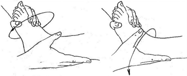 После массажа передней поверхности другой ноги выполните несколько пассивных движений, в том числе поворот стоп подошвами вовнутрь (рис. 76), нормализация положения пятки (рис. 77).