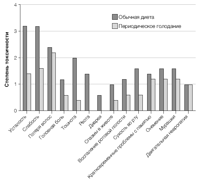 Пациенты голодали в течение 48–140 часов и прошли курс химиотерапии длиной от 5 до 56 часов в зависимости от конкретной ситуации. Никто из них, проходя в среднем по четыре цикла химиотерапии различными препаратами, не жаловался на побочные эффекты голодания, кроме чувства голода и головокружения. Шестеро пациентов проходили курс химиотерапии как с голоданием, так и без, и сказали, что во время голодания меньше чувствовались усталость и слабость. Они жаловались только на побочные эффекты в желудочно-кишечном тракте. Если рак прекращал развиваться, голодание нисколько не препятствовало воздействию химиотерапии (опухоль уменьшалась, и сокращался уровень онкомаркеров). Очевидно, что целью данного исследования было лишь собрать данные о реакции пациентов на сочетание голодания и химиотерапии. Затем мы провели полноценные клинические исследования.