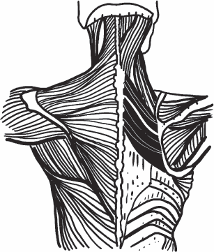 Функция мышцы: стабилизирует лопатки, сводит их сзади. Состоит из большой и малой ромбовидной мышцы. Одним своим краем крепится к остистым отросткам первого шейного и верхних пяти грудных позвонков. Другим краем прикрепляется к внутреннему краю лопатки (см. рис. 30).