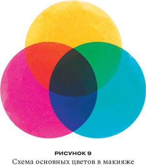 В этом колесе три основных цвета: желтый, циан и маджента (приводим английские названия, потому что все равно эту схему не переводили на русский, а производители используют английский язык для наименования косметики). Оно ценно потому, что объясняет, как получить более темный цвет без добавления черного.
