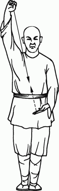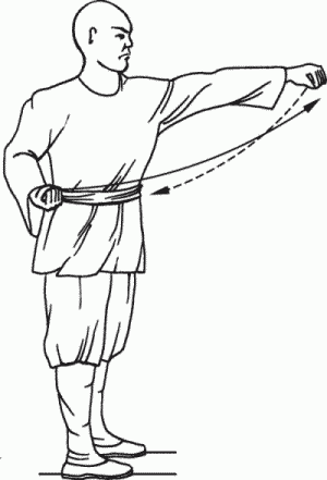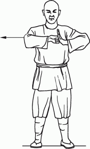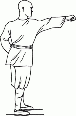 В позиции кайлибу (ноги на ширине плеч), кисти рук сжаты в кулаки (центр кулаков направлен вверх) и находятся на поясе. Немного подав вперед правое бедро с одновременным поворотом корпуса, произвести прямой удар кулаком правой рукой. Кулак при этом в последней четверти пути совершает вращение внутрь на 180 или 90 градусов (центр ладони повернут вниз – фуцюань, вбок – чжэньцюань). На всей траектории движения рука должна быть расслаблена, и напрягается она непосредственно перед соприкосновением с целью. Особо необходимо обратить внимание на формирование кулака и положение кисти.