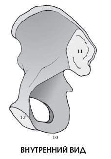 Изнутри имеются две суставные поверхности, одна, также покрытая хрящевой тканью (11), служит для сочленения с крестцом, а другая является частью лобкового сращения (12), с помощью которого спереди соединяются две тазовые кости.
