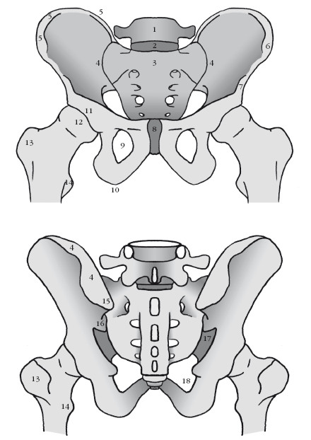 В тазовой кости выделяют две поверхности: внешнюю и внутреннюю. Снаружи на тазовой кости имеется характерный рельеф, называемый вертлужной впадиной (8). Это сферическое углубление, покрытое хрящевой тканью и служащее для соединения с головкой бедра.