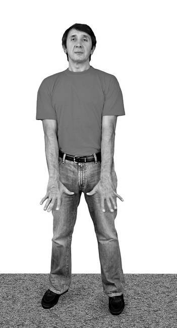 Плечи в момент вдоха напрягаются, руки вытягиваются в струну (тянутся к полу), пальцы рук широко растопыриваются. Это очень важно.